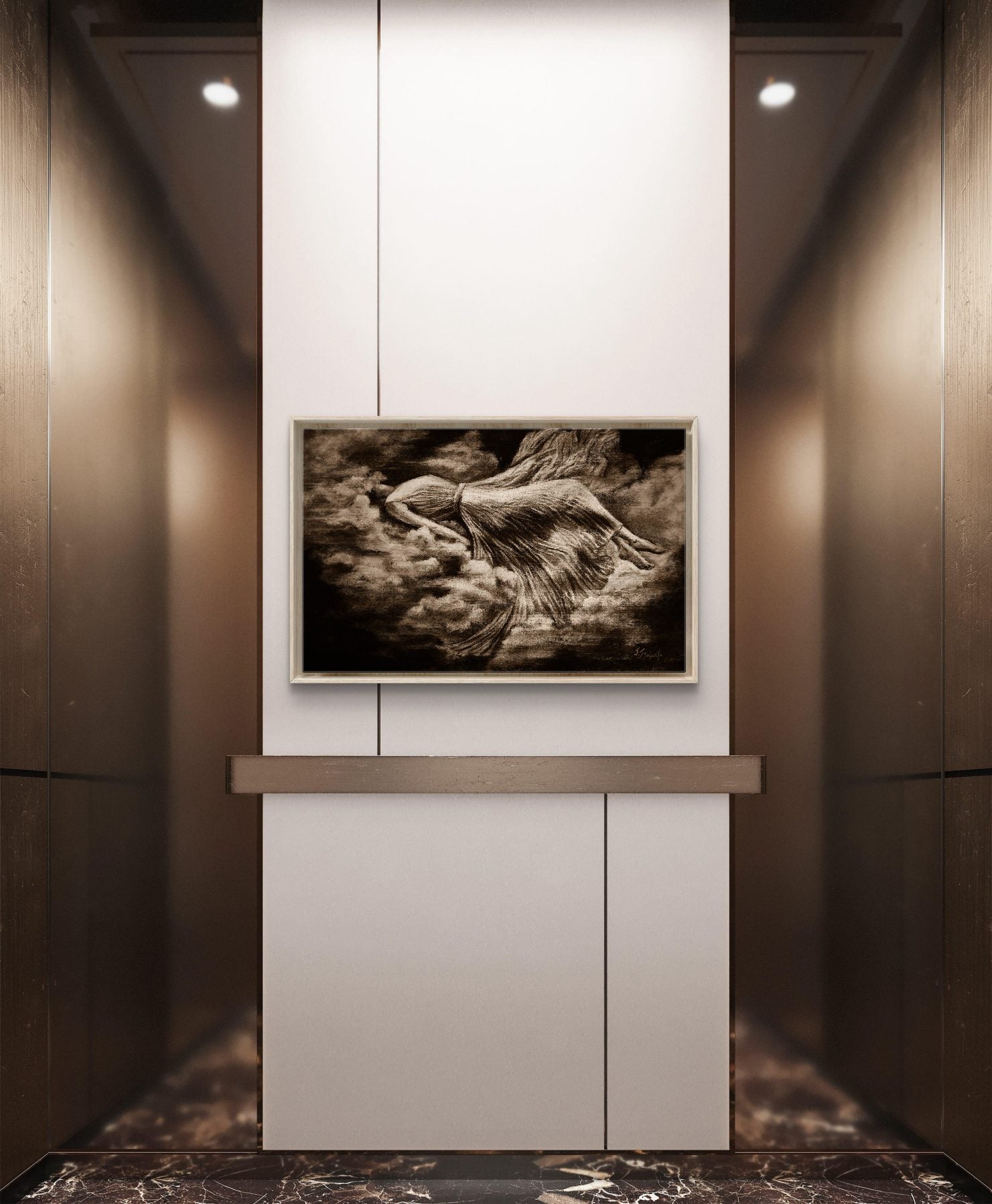 A floating figure, caught between wakefulness and sleep, drifts through clouds of light and silence. The body, freed from the weight of the earth, seems to dissolve into the intangible. The absence of a face underscores the anonymity of the dream — a soul momentarily leaving the world of matter to wander through the vastness of the unconscious. Soft shadows and fluid lines convey a sense of levitation, inner freedom, and the fragile peace that only dreams can offer.