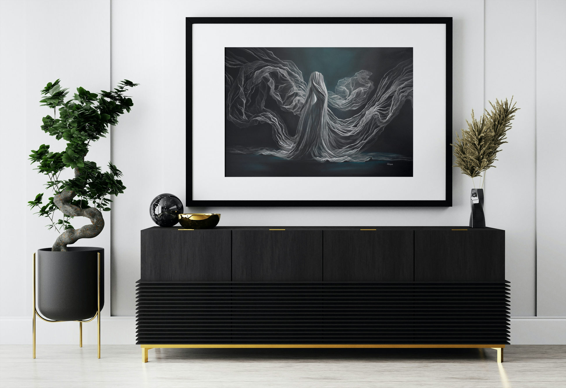A figure wrapped in airy veils—suspended between motion and stillness. The flowing fabric becomes more than a covering; it is a quiet statement of presence and absence, concealment and revelation. Surrounded by an embracing darkness, the figure dissolves into mystery, where the unseen carries more weight than what is visible.